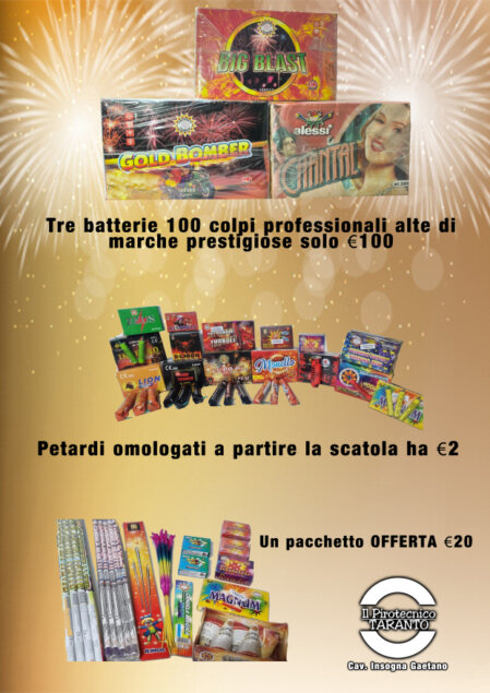 Quest'anno per il nuovo capodanno 2020 faremo delle SUPER OFFERTE Strepitose su tutto il materiale pirotecnico esistente presso i nostri depositi, che annunceremo prossimamente con foto/video e prezzi